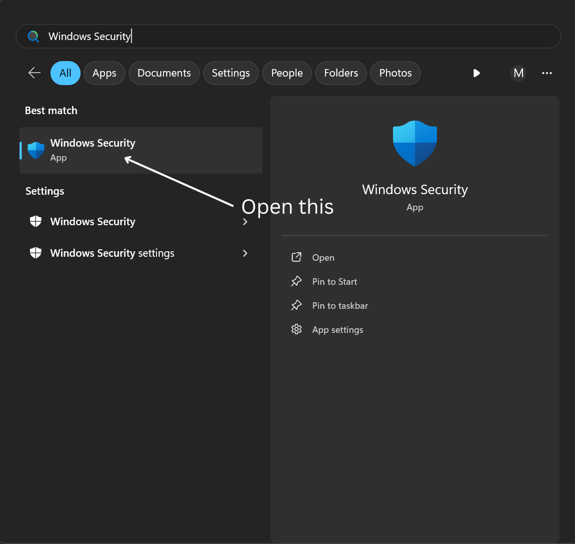 <figure><img src="https://1876323253-files.gitbook.io/~/files/v0/b/gitbook-x-prod.appspot.com/o/spaces%2FMbAyzvqBkfA7skENXXLJ%2Fuploads%2FGsWG82emOjWLABZv4guK%2FOpen%20this.png?alt=media&#x26;token=cb1b2663-5654-4301-919e-8241d630c9be" alt=""><figcaption><p>Navigate to Virus &#x26; Threat Protection.</p></figcaption></figure>